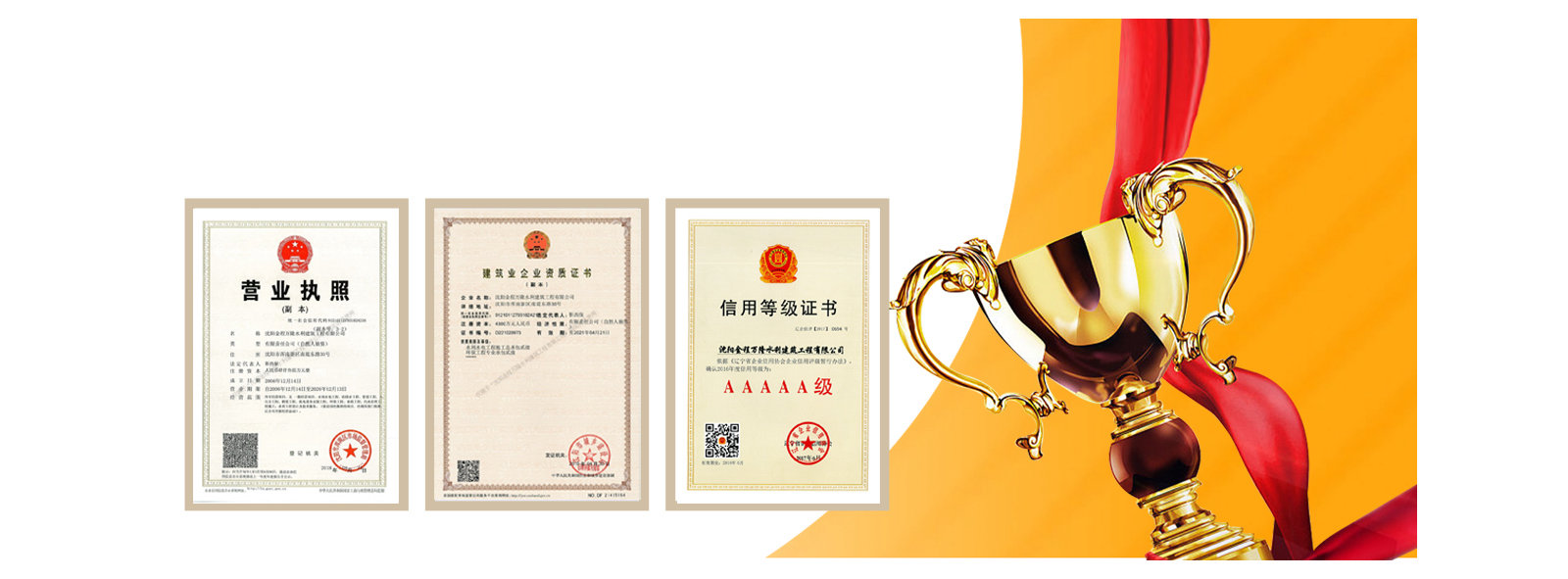 我公司先后受到遼寧省建筑業(yè)協(xié)會的好評,遼寧省及沈陽市工商局頒發(fā)的重合同守信譽企業(yè)稱號,勞動保障監(jiān)察書面誠信等級A,信用遼寧網(wǎng)站公示AAA等級,信用沈陽網(wǎng)站公示AAA等級,水利安全生產標準化二級單位,中國水利工程協(xié)會信用AAA等級,